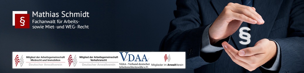 Rechtsanwalt Mathias Schmidt, Fachanwalt für Arbeitsrecht und Fachanwalt für Miet- und Wohneigentumsrecht unterstützt Sie mit größtem Engagement bei Ihrem Rechtsstreit und vertritt Ihr Recht vor und außerhalb des Gerichts.